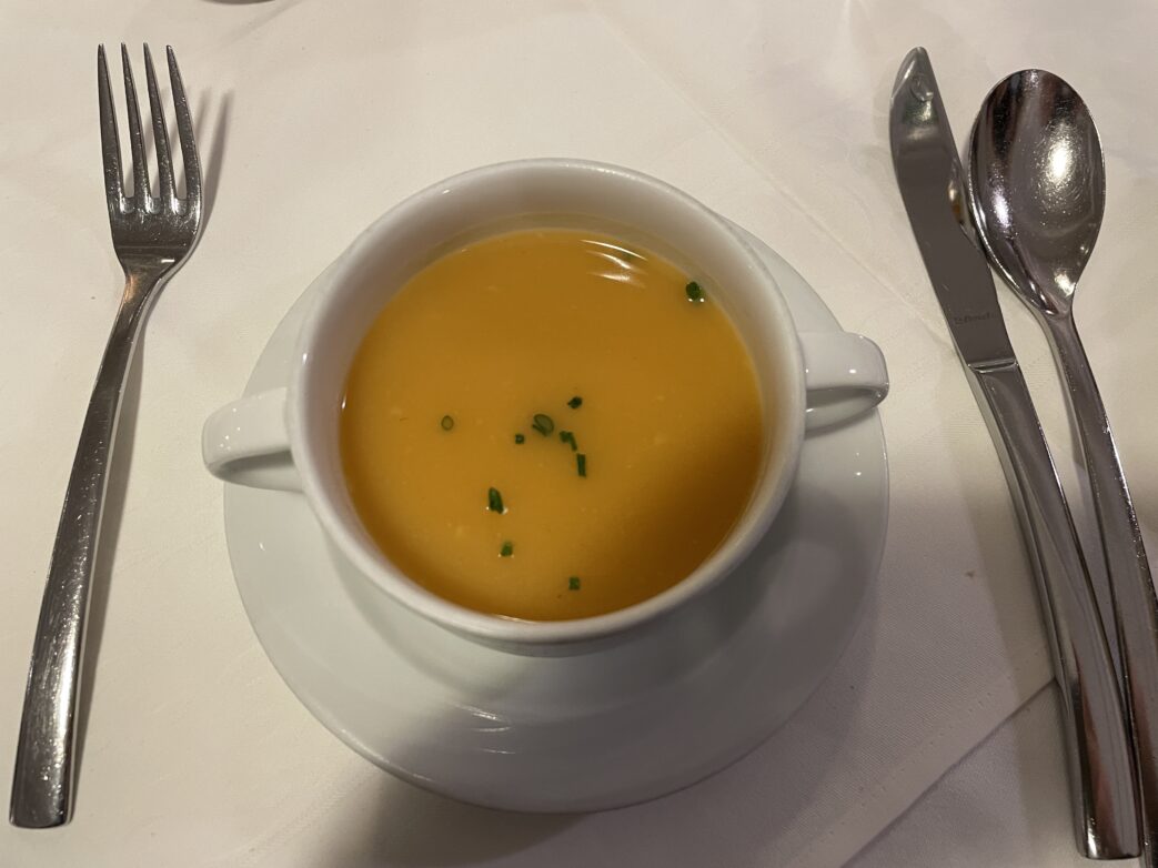 Das Abendessen war ein Genuss. Der Koch und seine Crew zauberten (übrigens jeden Tag – außer beim Willkommens- und Galamenü, wo es noch zwei zusätzliche Gänge gab-) ein leckeres Menü.