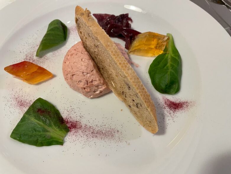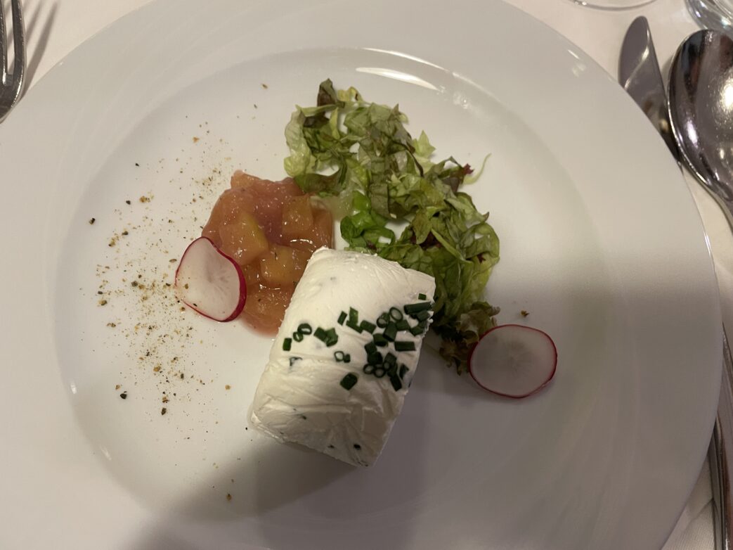 Als Vorspeise gab es eine Ziegenkäse-Terrine, danach eine Süßkartoffelsuppe. Als Hauptspeise gab es diese Auswahl:
