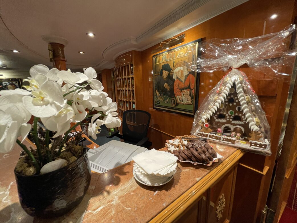 Doch die nächste Überraschung wartet am Abend auf uns. Um 19 Uhr sind alle Gäste an Bord, der Begrüßungscocktail mit Kapitän Rene Winkler, Hotelmanager Senad Cejvanovic und der Kreuzfahrtleiterin Silvia Baillod führt im adventlich geschmückten Salon alle 63 Gäste zusammen. Wir werden über die Sicherheit auf dem Schiff, zum Leben an Bord und mit einem Ausblick auf das am Tag darauf folgende Ausflugsprogramm informiert. Kurzentschlossene können sich bei der Kreuzfahrtleiterin immer noch ihren Ausflugswunsch anmelden.