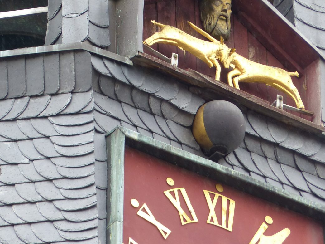 Das Uhrwerk im Turm des Rathauses stammt von 1580. Es stellt eine Besonderheit dar. Zwei vergoldete Ziegenböcke, die bei jeder Viertelstunde mit den Hörnern zusammenstoßen, sollen dem Stadtrat symbolisieren, dass man sich bei Ratssitzungen nicht die Hörner abstoßen solle. Im Neubau von 1935 an der Marktseite wurden Dachgiebelfenster mit Fresken und Darstellungen aus der Stadtgeschichte eingearbeitet.