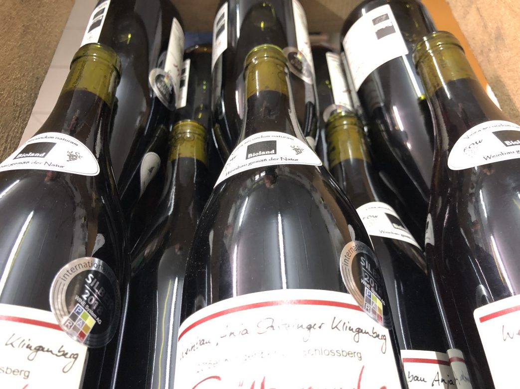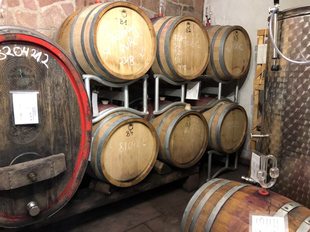 Unser Ziel ist heute das Bioweingut Anja Stritzinger. Der Familienbetrieb wurde 1972 von Willi Stritzinger gegründet. Anfänglich wollte er nur auf einem einzigen Traminer-Weinberg Wein für die Eigenversorgung herstellen. Doch über einen „Experimentierweinberg“ entwickelte er sich nach und nach zu einem kleinen wirtschaftlichen Weinbaubetrieb weiter. 1990 erfolgte die Umstellung auf ökologischen Weinbau nach den Richtlinien von Bioland. Seit 2001 wird der Weinbau Stritzinger von Tochter Anja im Haupterwerb betrieben. Ihr Weinbaubetrieb gehört dem bundesweiten Netzwerk Demonstrationsbetriebe Ökologischer Landbau an, von Apfelanbau über Rosenzucht bis Ziegenhof. Mehr als 23.000 Betriebe wirtschaften nach ökologischen Richtlinien. Aus dieser Vielfalt hat das Bundesministerium für Ernährung und Landwirtschaft über 240 Biohöfe zu Demonstrationsbetrieben ernannt. Diese Biobetriebe öffnen ihre Türen für alle Interessierten und zeigen, wie moderner Ökolandbau in der Praxis funktioniert. Die studierte junge Winzer- und Kellermeisterin führt uns zunächst in ihren Weinkeller, in dem sie uns auf ein Kastanienholzfass aufmerksam macht, das auf die pfälzischen Spuren ihrer Familie hinweist. Von der Lese bis Weihnachten lagert der Hauptwein in Churfranken aber vor allem in Eichenholzfässern. Zwischen 7.000 bis 10.000 Flaschen Weiß- und Rotweine werden in ihrem Keller jährlich abgefüllt.