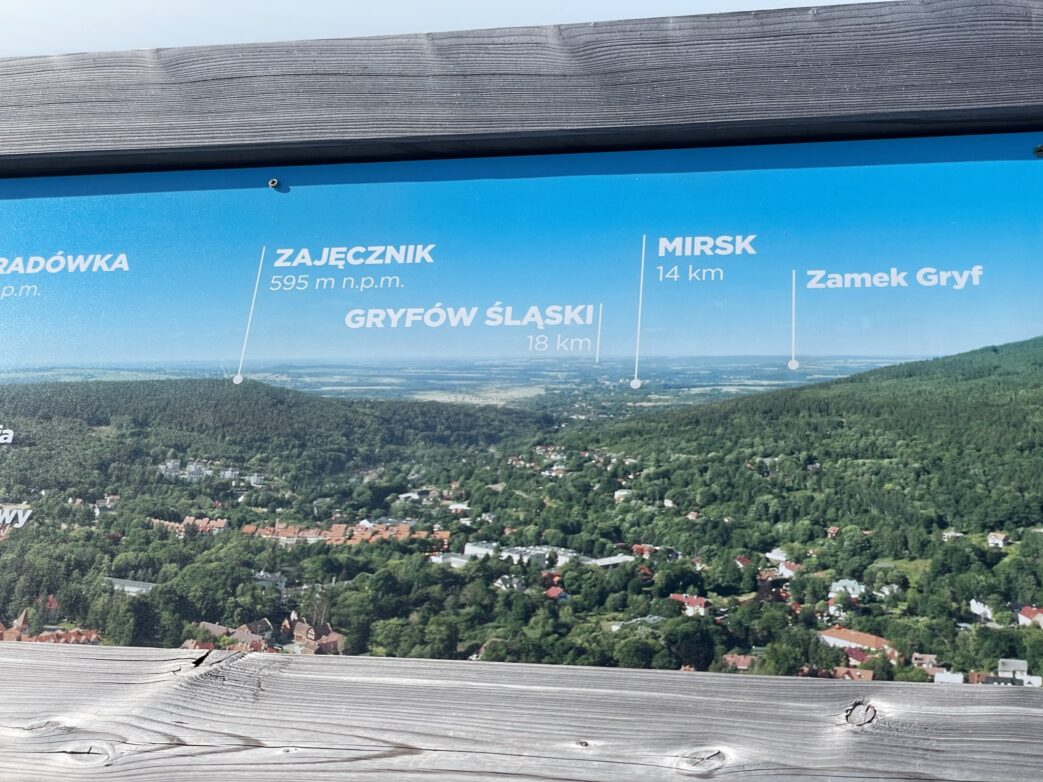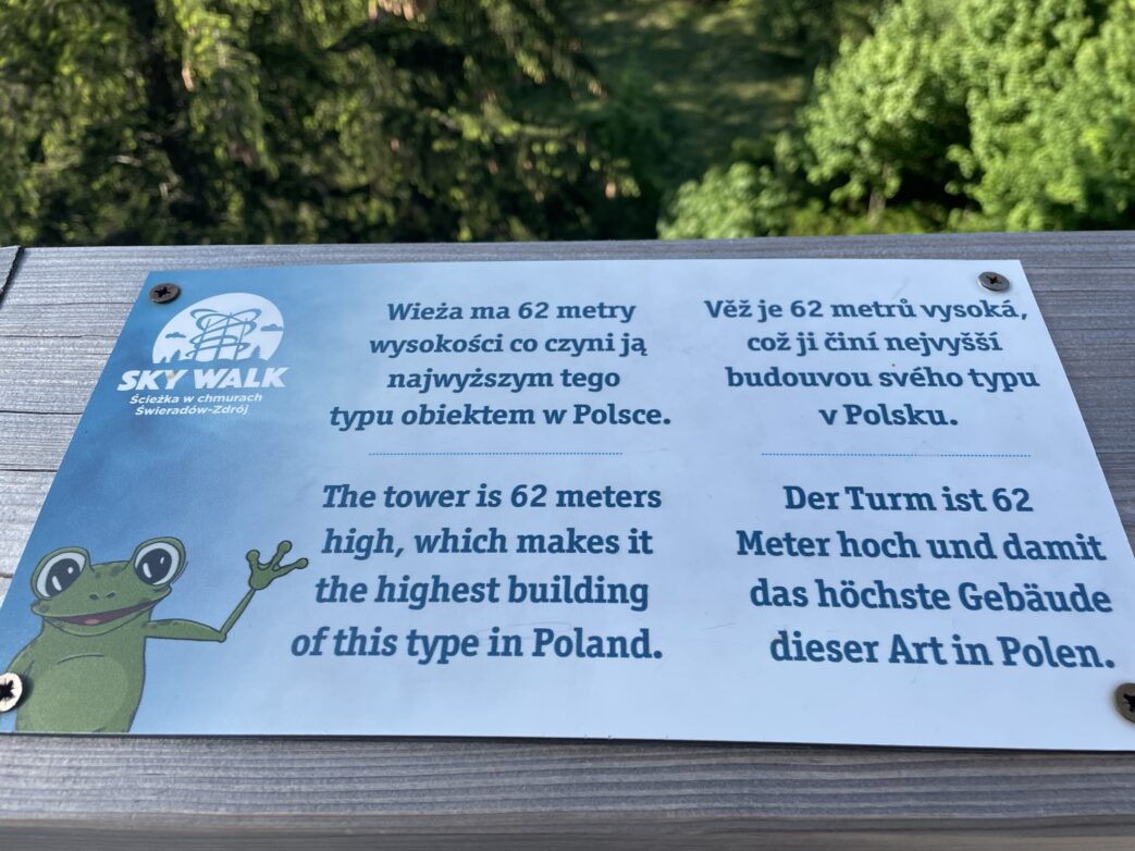 Auf jeden Fall zieht uns das einzigartige Wahrzeichen, das über der Kurstadt Świeradów Zdrój ragt, an. Der Sky Walk bringt uns bei einem angenehmen Anstieg auf eine Höhe von 62 Metern empor. Und immer wieder halten wir wegen herrlicher Ausblicke an, genießen die schöne Naturlandschaft des Grenzgebietes Deutschland-Polen-Tschechien und die romantische Landschaft. Auch die Hinweistafeln (polnisch/deutsch) mit unterhaltsamen Informationen über das Bauwerk und die Umgebung bieten kurzweilige Pausen während des 850 Meter langen, elegant geschwungenen Aufstiegs. Unterwegs begleitet uns der Frosch, das Maskottchen der Stadt.