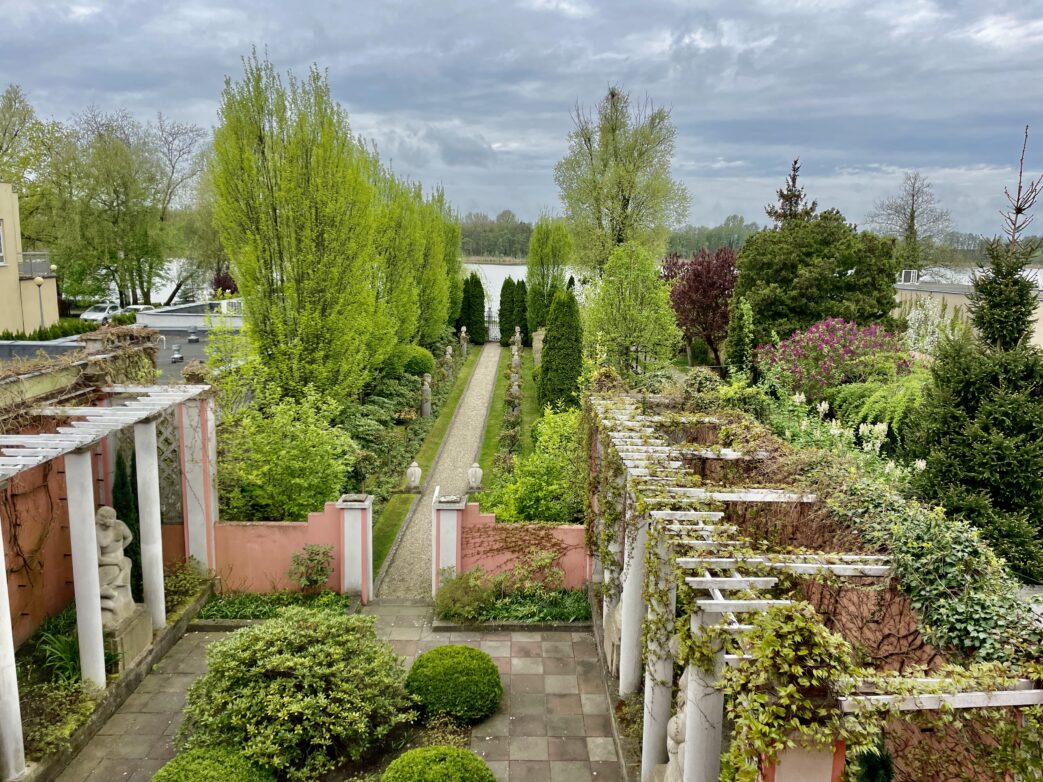 Eine große Fensterfront lenkt unsere Blicke in den Garten hinter dem Haus, der direkt zum See führt.