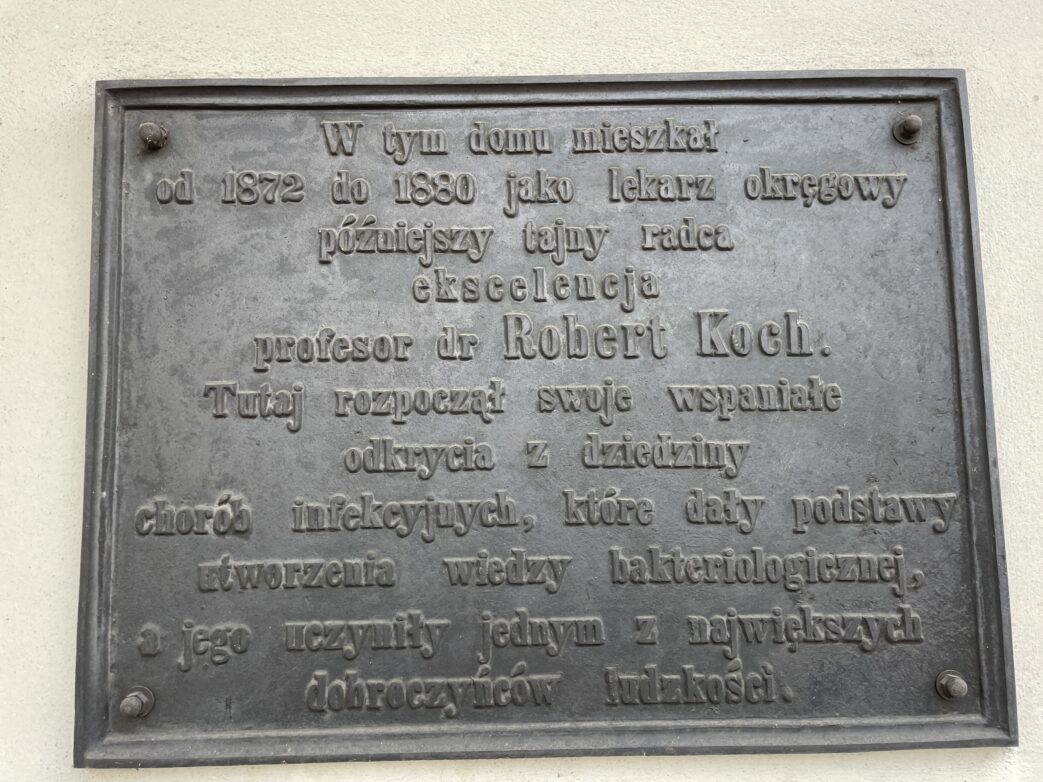 Zu den bekannten Persönlichkeiten, an die die Stadtverwaltung Wolsztyns im Stadtbild mit Museum (Rożek-Museum), Denkmälern (für den Geografen, Physiker und Literaten Stanisław Plater (1784-1851) vor der Stadtbibliothek, Büsten (für den Wissenschaftler Jósef Maria Hohne-Wroński (1776-1853) und Tafeln (für Józef Maria Hohne-Wroński am Geburtshaus in der Kościelna Straße 9) erinnert, gehört auch Robert Koch. Der Name des Mediziners ist in Deutschland spätestens durch die Corona-Krise sehr bekannt geworden. Denn das Berliner Robert-Koch-Institut (RKI) gab tägliche Rapporte über den Stand der Entwicklung der Corona-Krise. Heute wird über die Rolle des Robert-Koch-Instituts in der Corona-Zeit heftig debattiert.