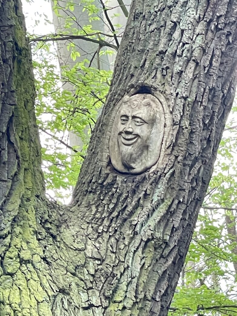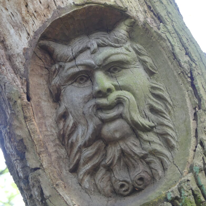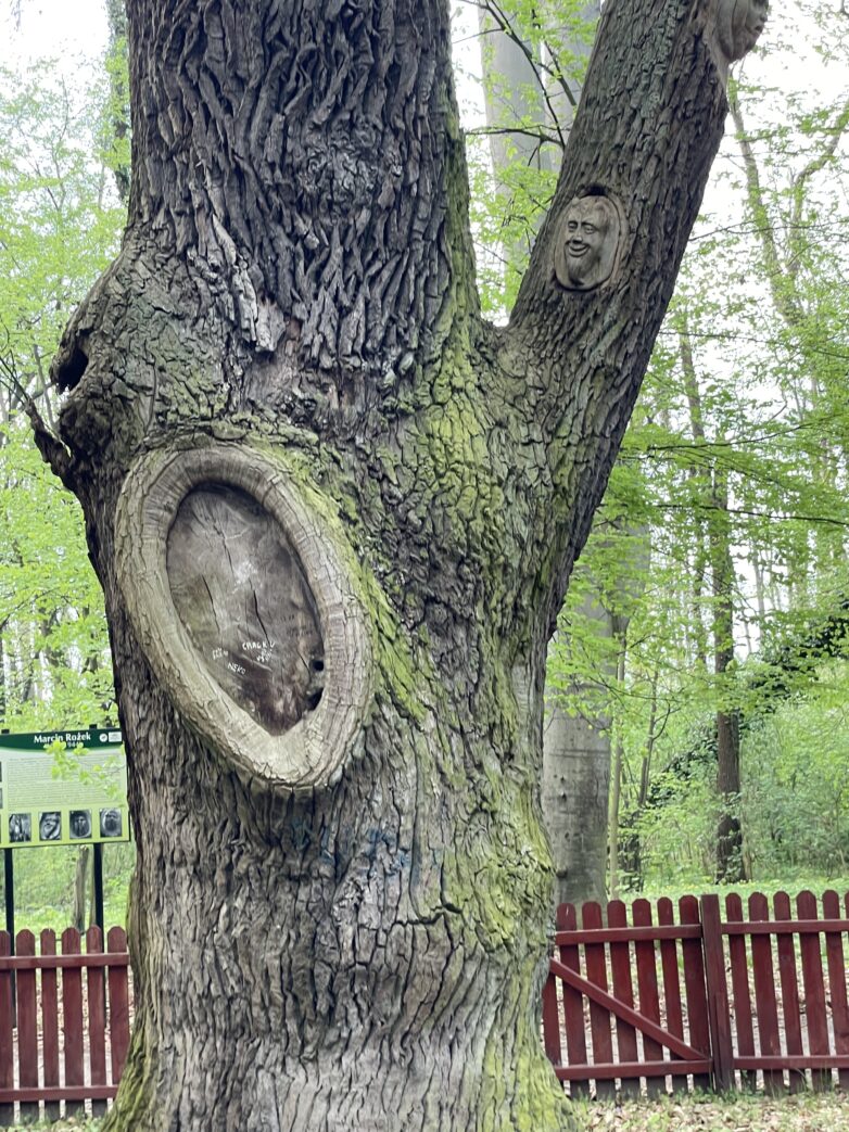 Uns fällt im Atelier ein dicker Eichen-Ast auf. Beim näheren Betrachten sehen wir, dass sich auf ihm flache Reliefs von Faun und Meduse befinden. Es ist das Originalwerk von Marcin Rożek. Hier erhalten wir den Hinweis, dass von Wieslaw Stepyra geschnittene Kopien im Stadtpark Wolsztyn zu finden sind. Anlass für uns, wenig später den benachbarten Stadtpark kennenzulernen.