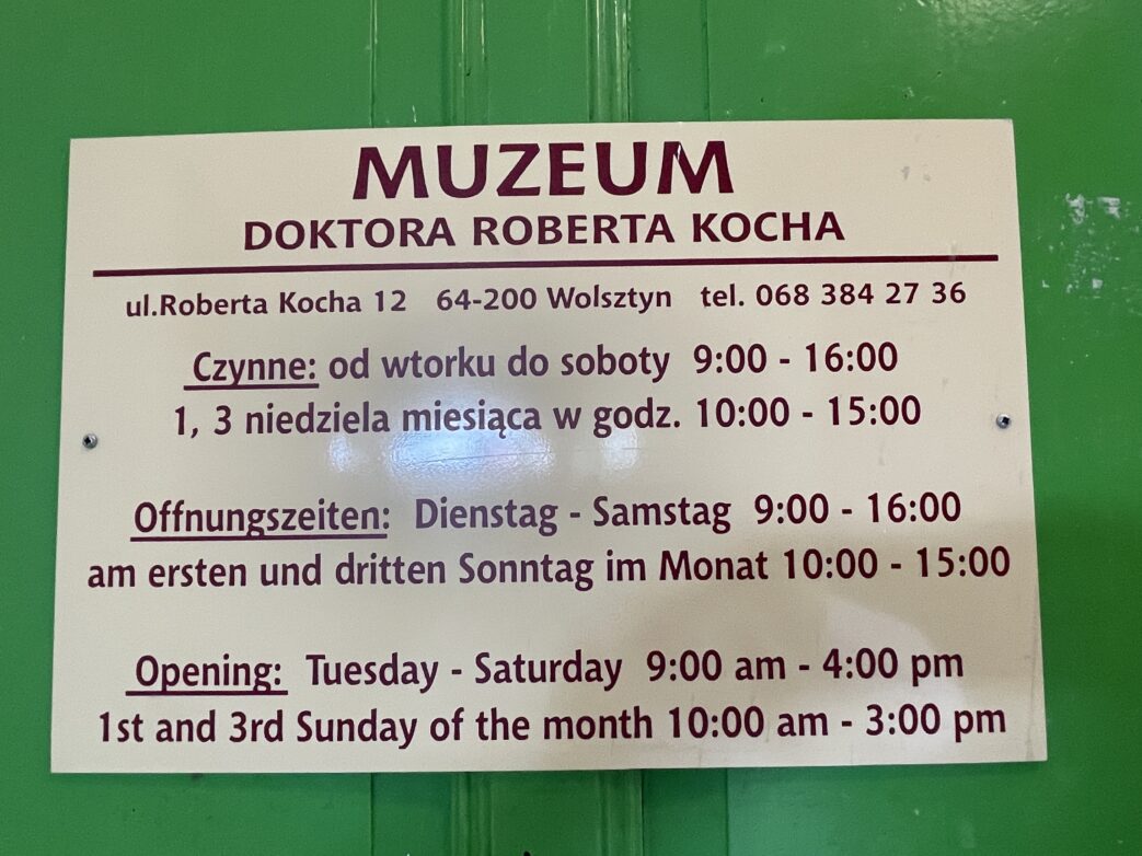 Im Hinterhof des Robert-Koch-Museums befindet sich die Tourist-Information Wolsztyn. Wir wurden von Kascha kundig auf deutsch über Sehenswürdigkeiten der Stadt und der Wojewodschaft Großpolen informiert. Mehrere Prospekte und auch ein Stadtführer sind auf deutsch und englisch vorrätig.