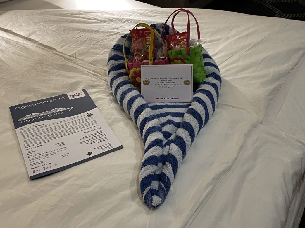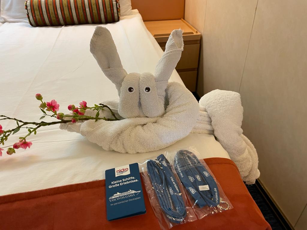 Hervorheben möchte ich an dieser Stelle aber auch den Komfort der täglichen Reinigung der Kabine. Für unser gutes Wohlfühlen sorgten die Kabinensteward/ess Ika und Made. Egal, zu welcher Tageszeit wir sie trafen, eine fröhliches „Guten Morgen“ oder „Guten Tag“ ging immer. Freundlich und zuvorkommend erfüllten sie unsere Wünsche. „Muffel“-Minuten oder schlechte Laune schien es bei ihnen nicht zu geben. Unsere Kabine war immer sauber, das Bett so exakt gemacht, in immer wieder neuen Varianten das Betttuch abends aufgeschlagen, wie ich es zuhause nie mache. In den 12 Übernachtungen wechselten sie mehrmals die Bettwäsche und Handtücher. Selbst die Schuhe waren zurecht gerückt.