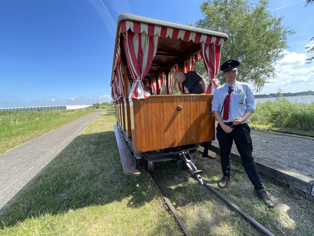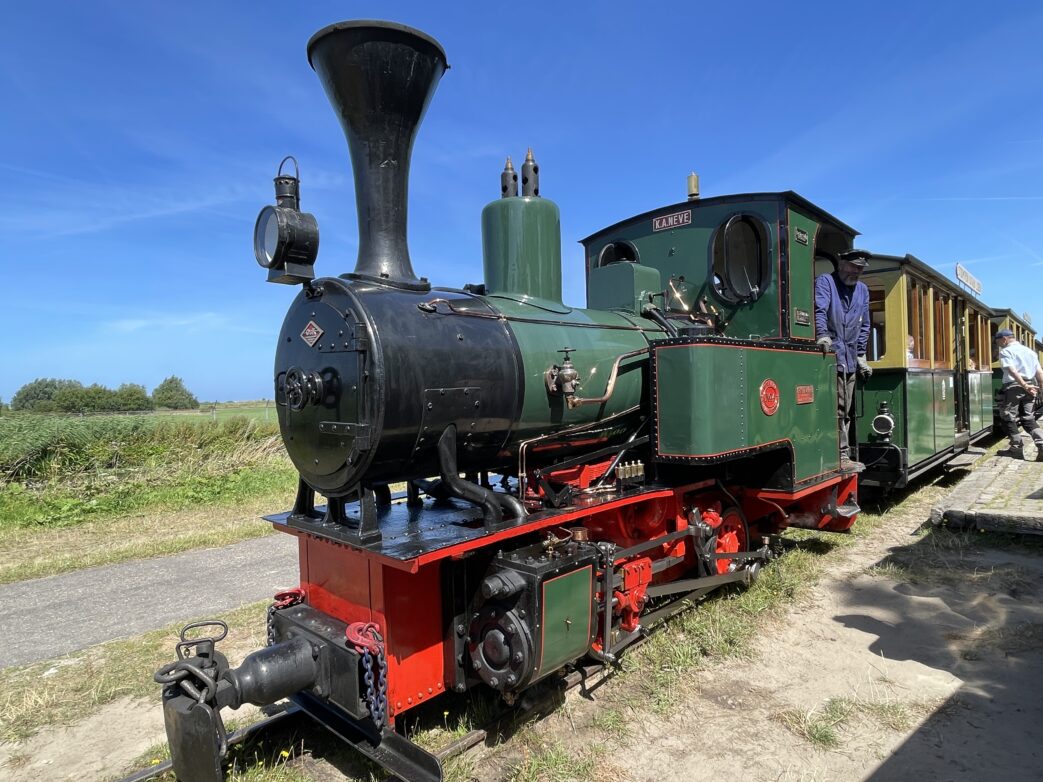 Wir schlängeln uns an den Wartenden vorbei ins Freilichtmuseum. Denn wir werden erwartet. Gustav (Gus) Brinkel, einer der rund 150 ehrenamtlich arbeitenden Mitglieder, der Stiftung steht am Eingang und sieht uns erwartungsvoll entgegen. Er ist nicht allein. Sein 9 Jahre alter Enkel Thijs steht stolz und selbstbewusst neben ihm. Beide können es kaum erwarten, uns „ihr“ Museum vorzustellen. 1970 – als die Schmalspurbahn noch in den Dünen fuhr, war der heute 67-jährige Gus 13 Jahre alt.
