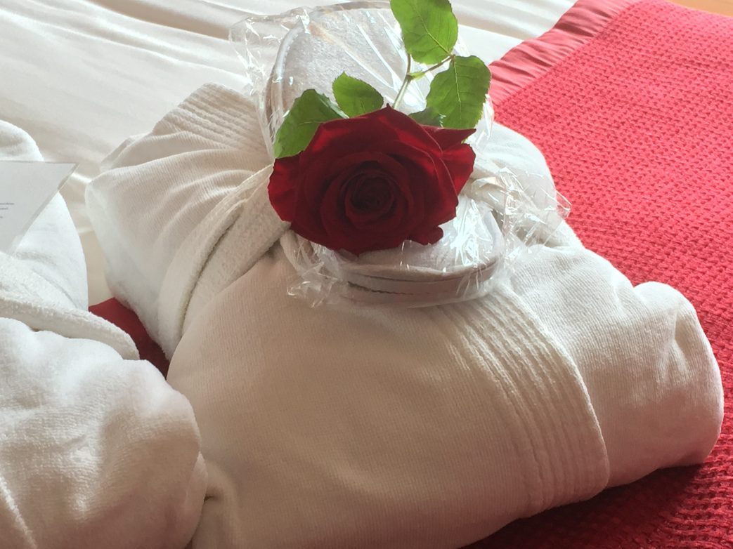 Mit großer Gelassenheit, Routine, selbstverständlicher Freundlichkeit hat jedes Mitglied der Crew schnell und unkompliziert reagiert. Ob an der Rezeption, im Spa-Bereich (mit Massage und großzügiger Sauna (!), im Restaurant, an der Bar, im Housekeeping, in der Küche oder in der Wäscherei: individuelle Wünsche stellten keine Probleme dar. Wir fühlten uns wohl, sehr gut um- und ver-sorgt. Dafür allen ein großes Dankeschön – Eigentlich haben SIE, das gesamte Bordpersonal, die Rose verdient, die wir zu Beginn unserer Reise auf dem Schiff erhielten.