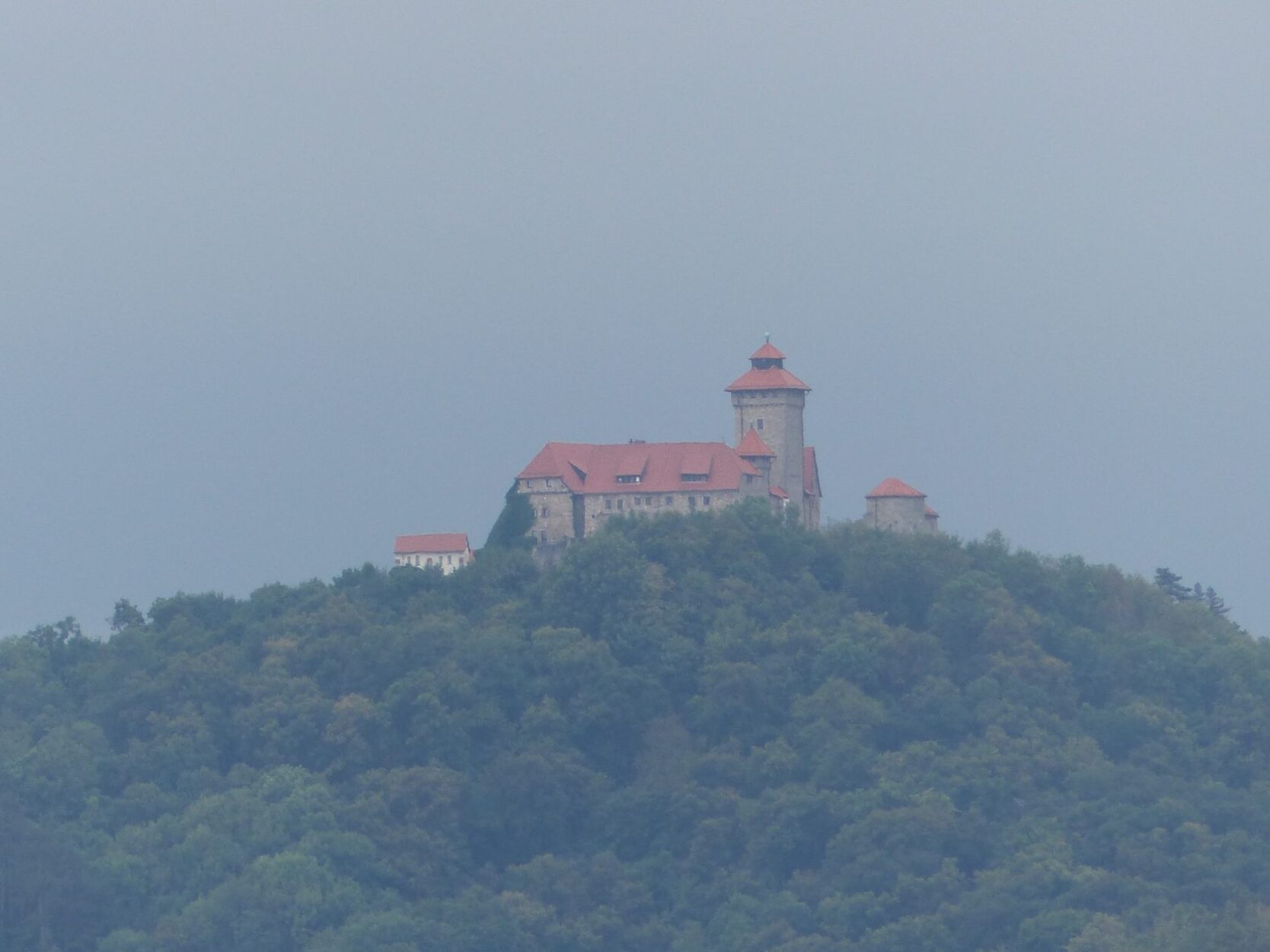 Irgendwann sind wir eingeschlafen, nach einer kurzen Nacht freuen wir uns auf das Frühstück, das mit frischem Obst, Wurstspezialitäten aus der Region, verschiedenen Käsesorten und Eierspeisen alles bereit hält für einen sehr guten Tagesstart. Und nun endlich können wir auf der Terrasse auch den bezaubernden Blick auf die Burgenlandschaft „Drei Gleichen“ genießen. Noch steht die Hitze nicht in der Landschaft, so dass das Frühstück auf der Terrasse rundum angenehme Momente bietet. Dazu die Tageszeitung – wir sind zufrieden.