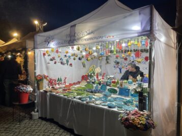 Wir wollten unsere beiden selbstgebastelten Engel mit ihren Wünschen an die Frau(en) bringen. Hatten wir im vergangenen Jahr den Breslauer Weihnachtsmarkt besucht, so mussten wir in diesem Jahr nicht ganz so weit fahren. Der Polnische Sternenmarkt nutzte den Hof und Marstall des heutigen Brandenburg-Museum für Zukunft und Gegenwart. Dort hatte u.a. das Polnische Fremdenverkehrsamt seinen Infostand und warb um Gäste. Handwerkliche Kunst, Kalender, Reiseliteratur, aber auch kulinarische Köstlichkeiten luden an mehreren Ständen in der Gewölbehalle wie im Innnehof zum Verweilen ein. Künstler auf der Bühne boten den musikalischen Hintergrund.