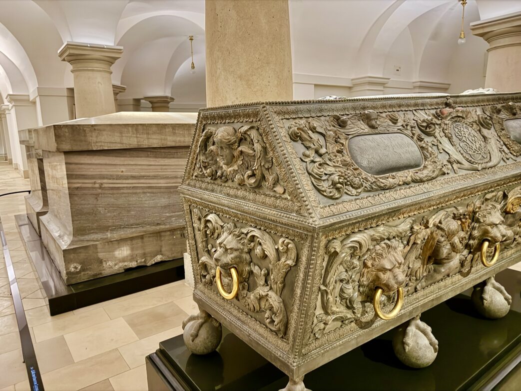 In der Hohenzollerngruft betreten die Gäste nun zuerst einen Vermittlungsraum: wertvolle Grabbeigaben, kurze Animationsfilme und ein interaktives Gruftmodell laden zum Verweilen ein. Hier gibt es Wissenswertes zur Geschichte der Grablege, zur Hohenzollern-Familie und Geschichten über die Menschen, die in der Gruft bestattet sind, zu erfahren.