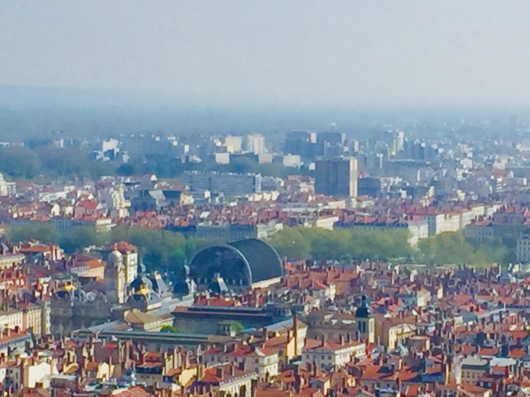 Im Deutsch-Französischen Krieg 1870/71 legten die Bürger von Lyon das Gelübde ab, das Heiligtum von Fourvière zu vergrößern und zu verschönern, falls ihre Stadt von preußischer Besatzung verschont bliebe. Der Wunsch ging in Erfüllung, und schon 1872 wurde der Grundstein für die viertürmige neue Kirche nördlich neben der alten Marienkapelle gelegt. 1896 wurde sie geweiht. Seit 1897 ist sie eine Basilica minor (kleine Wallfahrtskirche). Die Wände und hohen Decken des Innenraums sind reich bemalt und mit vielen Mosaiken und Gold verziert. Besonders schön leuchten die Buntglasfenster mit den biblischen Motiven, wenn die Sonnenstrahlen auf sie treffen. Von der Aussichtsplattform direkt neben der Basilika hat man einen grandiosen Panoramablick hinab auf Lyon und den Zusammenfluss von Rhône und Saône – wenn das Wetter gut ist. Leider ist es an diesem Tag sehr diesig, die Sicht sehr eingeschränkt. Vor der Aussichtsplattform lassen wir an einem Modell der Altstadt noch einmal unsere Tour Revue passieren. Hier macht uns die Stadtführerin auf eine Ausgrabungsstätte von 1935 aufmerksam, die nur einen kleinen Fußweg entfernt von der Basilika liegt. Das kleine und das größere antike römische Amphitheater hoch oben auf dem Berg Fourvière wurden zwischen dem 1. und Mitte des 2. Jahrhundert nach Christus erbaut. Die Anlage zählt zu den drei ältesten außerhalb des heutigen Italien. Im Sommer finden hier Konzerte und Theateraufführungen statt.