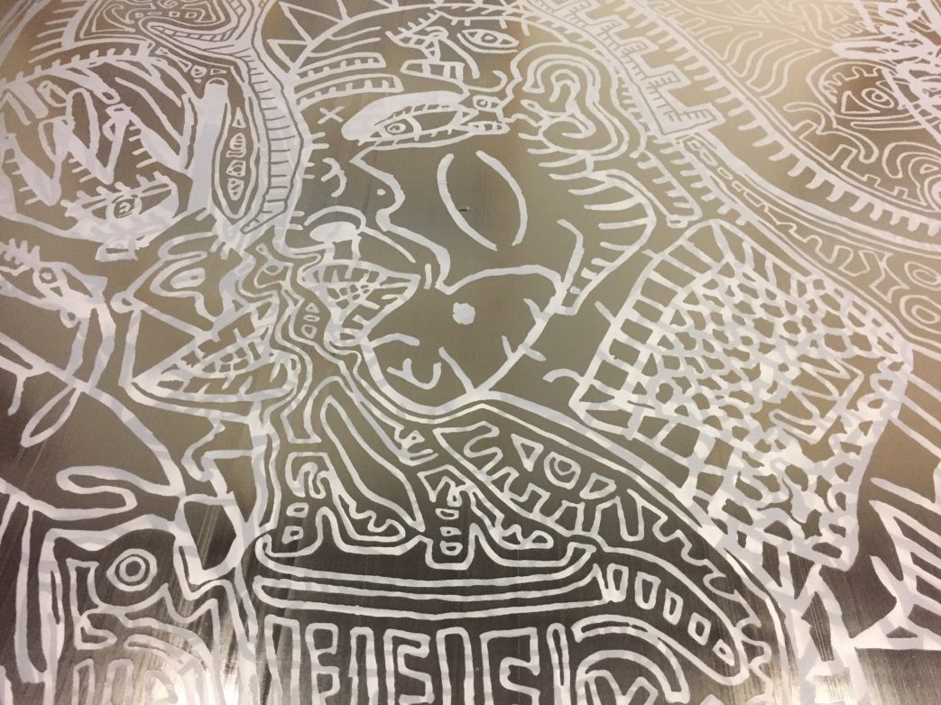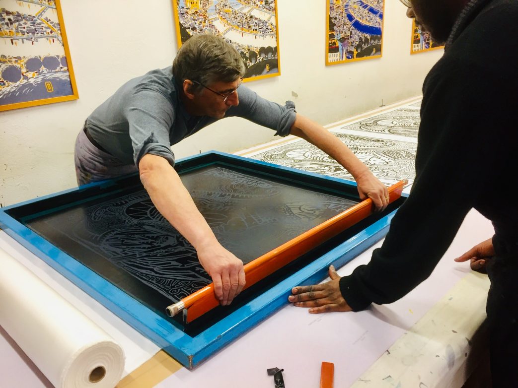 Genet Gerary erklärt uns, dass zunächst der weiße Seidenstoff auf einen großen Tisch gespannt wird. Das zu druckende Motiv setzt sich aus acht Klischees zusammen, jedes Klischee benötigt eine eigene Farbe. Insgesamt werden für den Siebdruck also acht etwa ein Meter große Rahmenschablonen (-siebe) benötigt. Jede Schablone besteht aus einem Rahmen, der eine feinlöchrige Kunststoffgase umspannt. Die Gase wurde zuvor mit dem Motiv für die jeweilige Farbe bedruckt. Die dickflüssigen Farben werden jeweils in der Werkstatt angerührt und dann in der Rahmenschablone mit einem Rakel gleichmäßig verteilt. Erst nachdem die Farbe vollständig getrocknet ist, kann mit der nächsten Rahmenschablone die nächste Farbe und damit auch das nächste Klischee aufgebracht werden. Der Seidenstoff wird zweiseitig bedruckt. Danach wird der bedruckte Stoff im Dampfbad „gewaschen“, ehe er appretiert und umsäumt wird. Nun fühlt sich der Seidenstoff weich und glatt an. Das Tuch schmeichelt der Haut.
