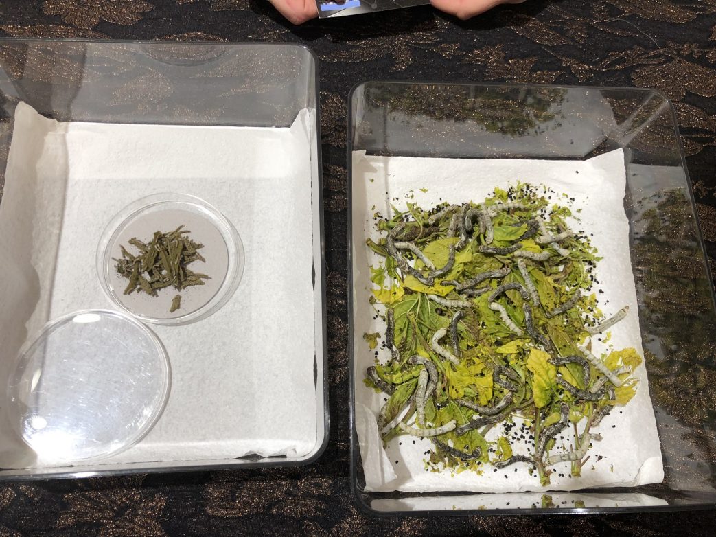 Während unseres kurzen Spaziergangs durch die Altstadt kehren wir auch in der Boutique Brochier Soieries 1890 ein, dem traditionellen Seidenhaus, ein. Hier erleben wir eine Überraschung. Auf dem Ladentisch liegen in drei Glasschalen Larven von Seidenraupen. Im Kokon – gerade drei Tage alt – und geschlüpft, nun bereits drei Wochen alt. Kinder standen staunend um den Tisch herum und beobachteten das Gewusel. Im hinteren Arbeitszimmer konnten wir dann auch sehen, wie der hauchdünne Seidenfaden auf eine Spule gewickelt wird, ehe er zum Seidenchiffon verarbeitet wird. Auch hier kann man beim Bemalen des Seidenstoffes zuschauen. Noch ist Vorsaison, der Besucherandrang hält sich in Grenzen, so dass Zeit und Platz zum ausgiebigen Zuschauen bleibt. Ich spüre den Stolz und die Freude, mit dem die Mitarbeiterin ihr umfangreiches Wissen über die Seidenherstellung und Farb-Veredelung an die Touristen weitergibt.