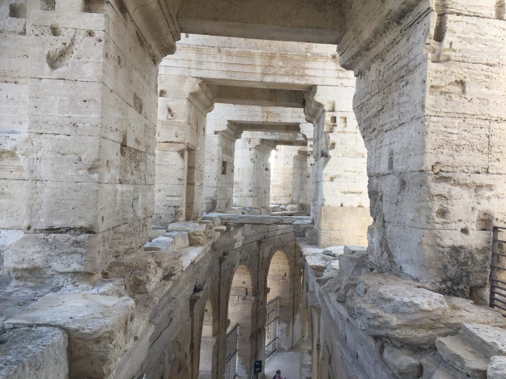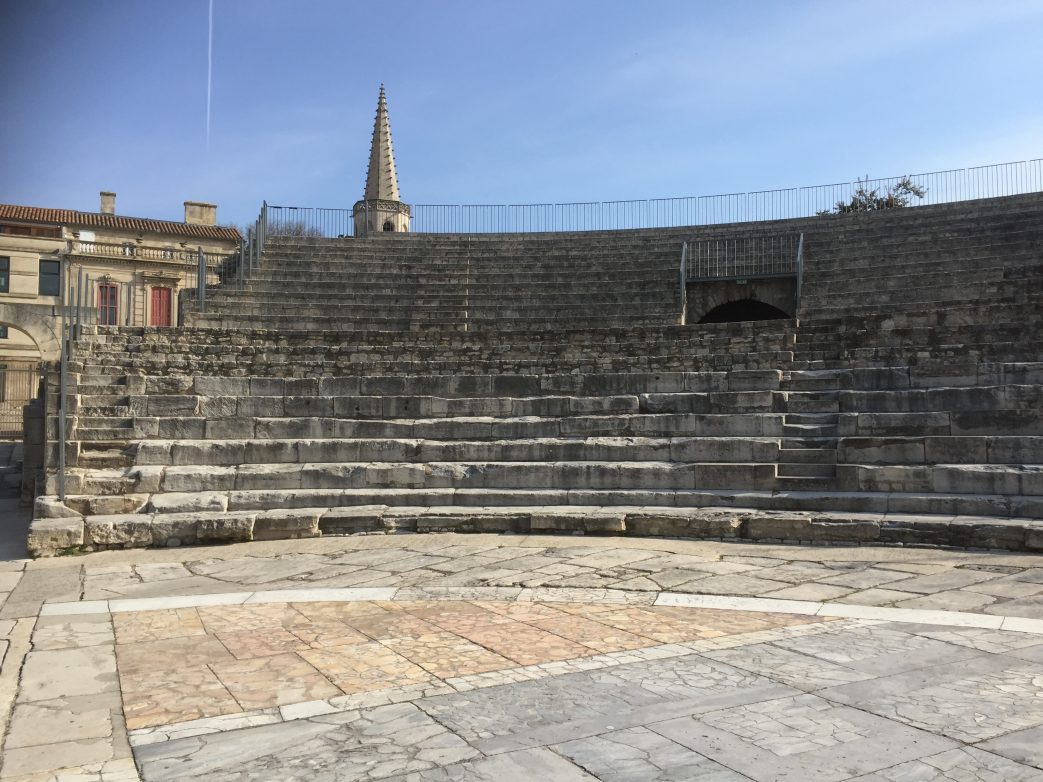 Das am Ende des 1. Jahrhunderts gebaute Amphitheater, das 136 x 107 Meter misst, konnte ungefähr 21.000 Zuschauer auf den ansteigenden Sitzreihen im Mittelalter Platz bieten, die Spielen und Gladiatorenkämpfen beiwohnten. Heute ist die Arena ein wichtiger Veranstaltungsort für die ab Ostern stattfindenden Stierkämpfe. 12.500 Zuschauer finden heute auf den Rängen Platz. Noch sind während meines Besuches nur wenige Besucher in der Arena, die gerade erst geöffnet hatte.
