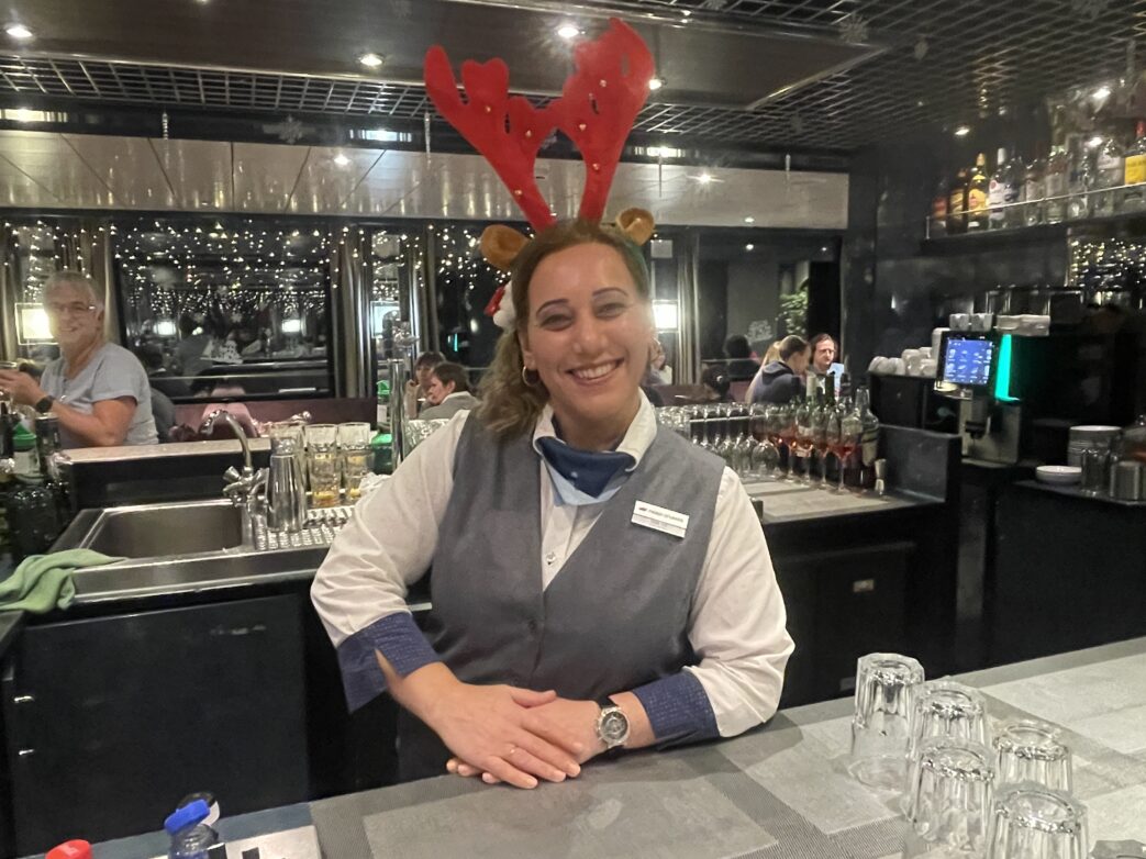 Und auch wir werden auf der diesjährigen Adventsreise nicht enttäuscht. Nicht nur die Reiseziele Nürnberg, die UNESCO-Welterbestadt Regensburg, das Kloster Weltenburg und die Befreiungshalle Kelheim brachten viele neue Eindrücke. Die Weihnachtsmärkte einigen Trubel, aber das Konzert in der Lorenzkirche in Nürnberg auch Momente der Ruhe. So wie das Plätschern der Wellen während der Fahrt auf dem Main-Donau-Kanal, oder das Befahren der 22 Schleusen. Dank des großen Geschicks des 31-jährigen Kapitäns verlaufen diese ganz unaufgeregt, kaum gibt es eine Berührung mit der Schleusenwand. Die meisten Schleusungen erfolgen in der Nacht, aber das nautische Personal ist so leise, dass kaum ein Schiffsgast in seiner Ruhe gestört wird. Die gesamte Crew – 42 Mitarbeiterinnen und Mitarbeiter aus 16 Nationen – wirkt unauffällig und leise im Hintergrund. Oft auch amüsant und für gute Laune sorgend. Ob als Barmusiker im Salon oder als tanzende Barchefin mit ihrem Schnapsi-Taxi, den Gästen gefällt es. Es animiert zum Tanzen bis spät in den Abend. Auch eine Tombola am letzten Abend sorgt für Stimmung, deren Erlös auch der Mannschaft zu Gute kommt.