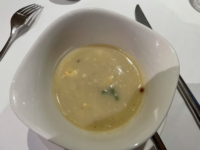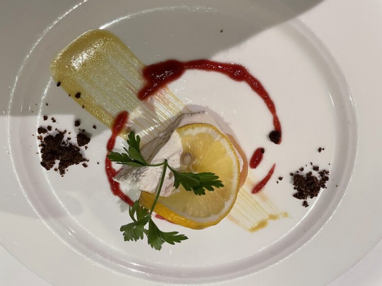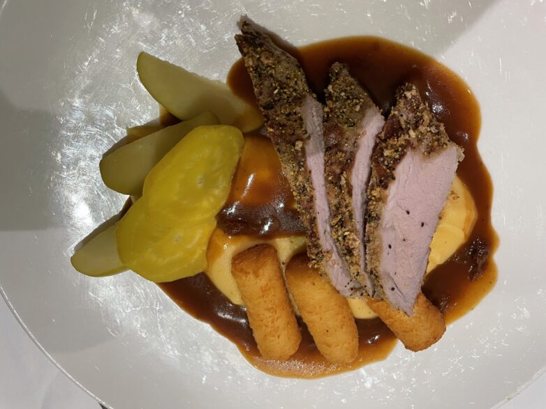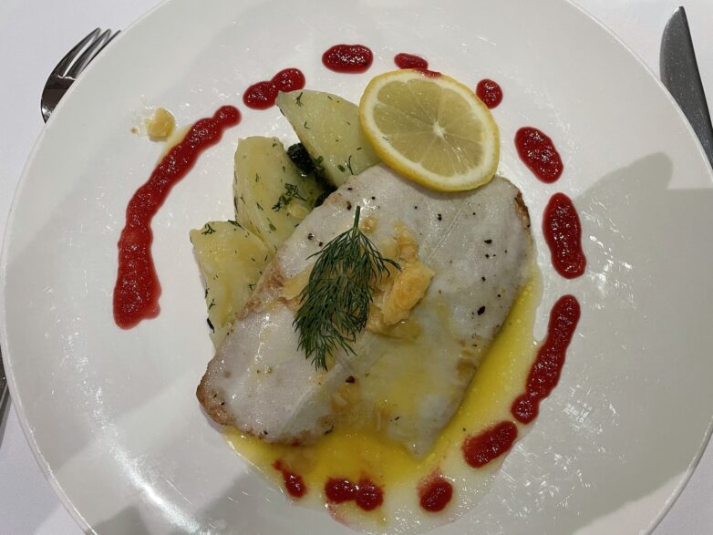 Und dann gab es das erste Abendessen während unserer Reise. Eines vorweg: Wir wurden verwöhnt: Morgens mit einem reichhaltigen Frühstücksbüfett. Maske und Handschuhe, die sich jeder am Büfett nehmen konnte, waren Pflicht. Dazu ein aufmerksamer und humorvoller Service, der den Tagesbeginn leicht machte. Das Mittag- und Abendessen gab es a la Carte. Bei den Hauptgerichten konnte man zwischen drei Gerichten wählen (Fisch, Fleisch, vegetarisch). Mittags gab es drei Gänge (Vorspeise: zwei Gerichte zur Auswahl, Hauptspeise: drei Gerichte zur Auswahl, Dessert: zwei Gerichte zur Auswahl, abends gab es vier abwechslungsreiche Gänge (Vorspeise, Suppe, Hauptspeise, Dessert). Dazu gab es zu jeder Mahlzeit eine Weinkarte mit einer täglichen Weinempfehlung und für einen Digestif nach dem Essen. Mir haben besonders die Fischgerichte geschmeckt: gegrilltes Köhlerfischfilet / Oliventomatensalsa / Zucchinigemüse / Cremiges Polenta; gebratenes Flunderfilet / Mandelbutter / Blattspinat / Dillkartoffeln oder der mit Rosmarin marinierte Zander / Zwiebel-Tomatenconfit / Selleriemousselin / Dillkartoffeln am Galaabendessen waren ein Genuss. Aber auch die Hauptspeisen zum Mittagessen, wie der Semmelklos mit Pilzragout und Gartenkräutern oder das Schweinefilet mit Zitronen-Pfefferkruste an Cognac-Rahmsoße mit Kürbisstampf waren lecker. Auf Wunsch gab es bei Bedarf auch eine größere Portion, wie wir an unserem Tisch beobachten konnten. So macht man Gäste glücklich.