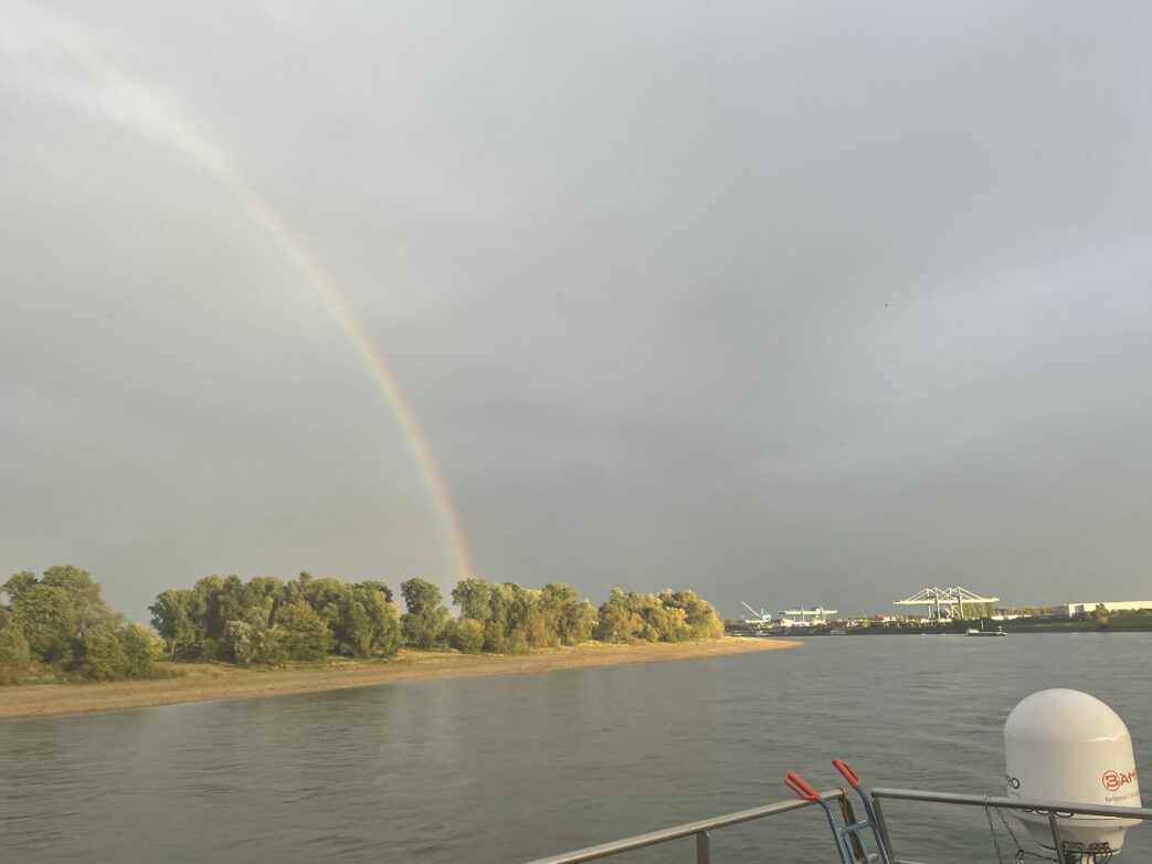 Der/die Regenbogen war/en für mich das verbindende Element der viertägigen Reise. Farbenfroh, optimistisch, verbindend. Als Kind träumte ich davon, ihn über eine Leiter zu erreichen. Irgendwie hat ein Regenbogen immer gute Laune gebracht und Freude ausgelöst. Das war auch bei vielen Flusskreuzfahrtgästen zu beobachten. „Oh und ah, schaut mal dort, ist das schön“, waren mehrmals zu hören. Es mag nicht die schönste Strecke auf dem Rhein sein, das mag jeder anders empfinden, aber mal auf dem Schiffsdeck zu jeder Tageszeit sitzen zu können und dabei die vorbeiziehende Natur zu beobachten, seien es die teils gigantischen Brückenkonstruktionen, die modernen Bauwerke an den Ufern, die Tierwelt auf und im Wasser oder einfach nur dem Wellengang zuschauen und dabei die Seele baumeln lassen. Und am Abend, wenn die Sonne untergeht, sich fragen, warum kann ein Windrad nicht gleich seine Energie aus der Sonne direkt beziehen – eine optische Täuschung regt dazu an.