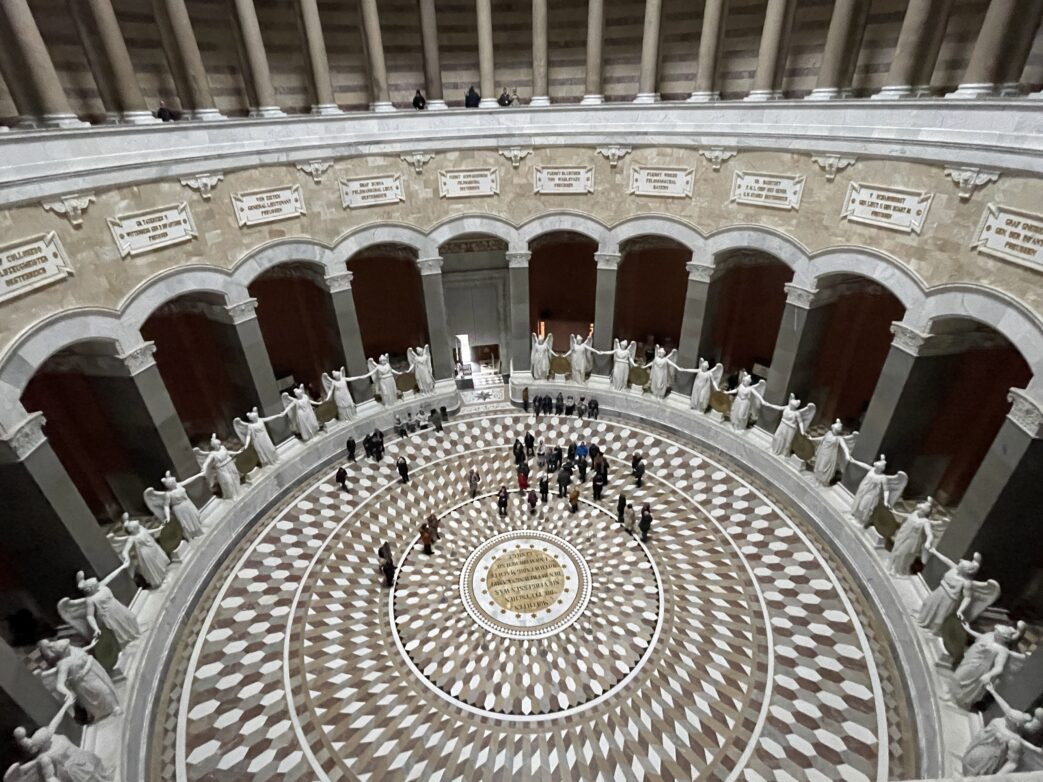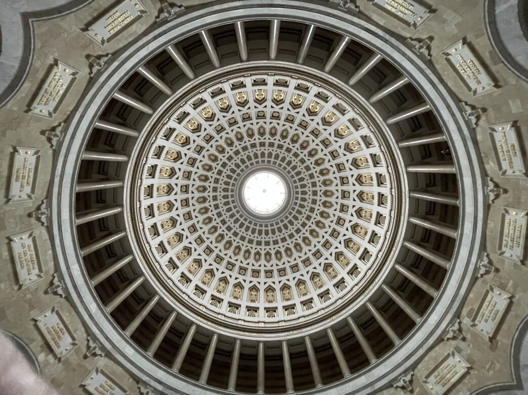 Die reiche Kassettendecke der 45 Meter hohen Kuppelhalle und die Gliederung der Wand mit Nischen, Arkadenreihe und Galerie verleihen dem Raum eine erhabene Raumwirkung.