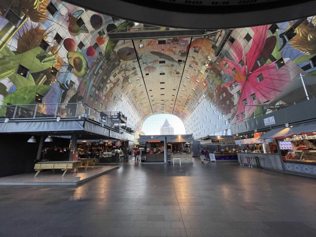 Die Decke der Markthalle ist mit dem monumentalen Kunstwerk „Füllhorn“ von Arno Coenen und Iris Roskam geschmückt, das riesige Früchte und Gemüse darstellt.