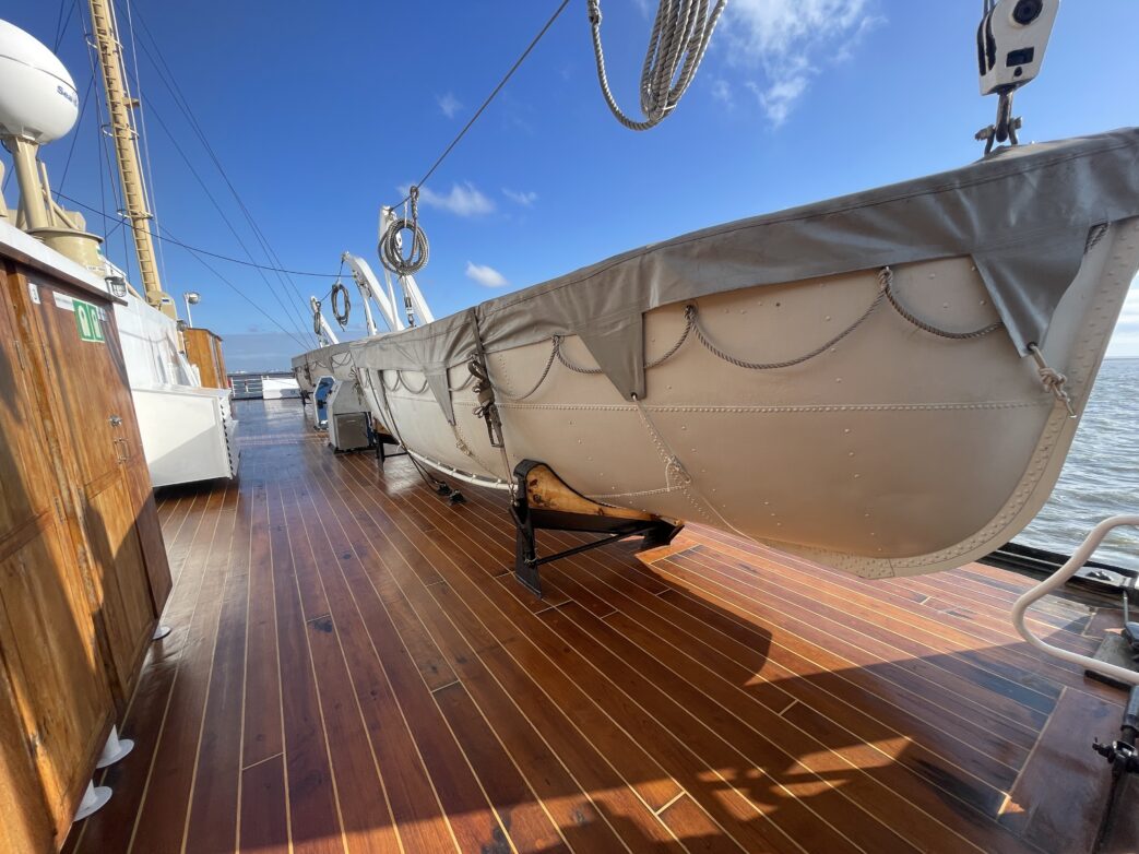 Solide Rettungsboote, die man auch rudern kann. Natürlich gibt es auch moderne Rettungsinseln an Bord.Obwohl das Schiff noch über die höchste norwegische Eisklasse 1 verfügt. Vorgeschrieben sind in dem Revier geschlossene Rettungsboote. Und deren nachträglicher Einsatz auf dem Schiff würde, so das norwegische Denkmalgesetz, den originalen Erscheinungscharakter des Schiffes verändern. So musste Vestland Classic für ihr Flaggschiff, das in den letzten Jahren im Charter auch für Hurtigruten fuhr, sich neue Fahrtziele suchen.