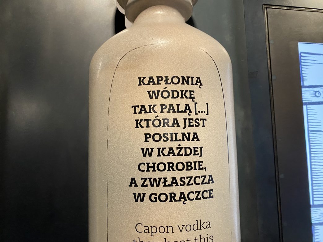 Żubrówka ist Wodka, der auf Basis von Bisongras hergestellt wird und dadurch ein besonderes Aroma erhält. In Deutschland kennt man ihn meist unter der Marke Grasovka. Der polnische Name leitet sich vom Wort żubr (Wisent) ab. Im Nordosten und Norden Polens sowie auf der Insel Wolin leben wieder ausgewilderte Wisente in urwaldähnlichen Nationalparks. Żubrówka wird pur oder mit Apfelsaft getrunken. Auch über Orzechówka, der aus Walnußfrüchten hergestellt wird, erfahre ich im Museum. Die Früchte werden in Würfel zerschnitten und mit Branntwein übergossen. Empfohlen wird die Beigabe von Gewürznelken und Zucker nach Geschmack. Nach einem halben Jahr entsteht ein dunkelbrauner Likör. Eine weitere Besonderheit ist Kräuterwodka.