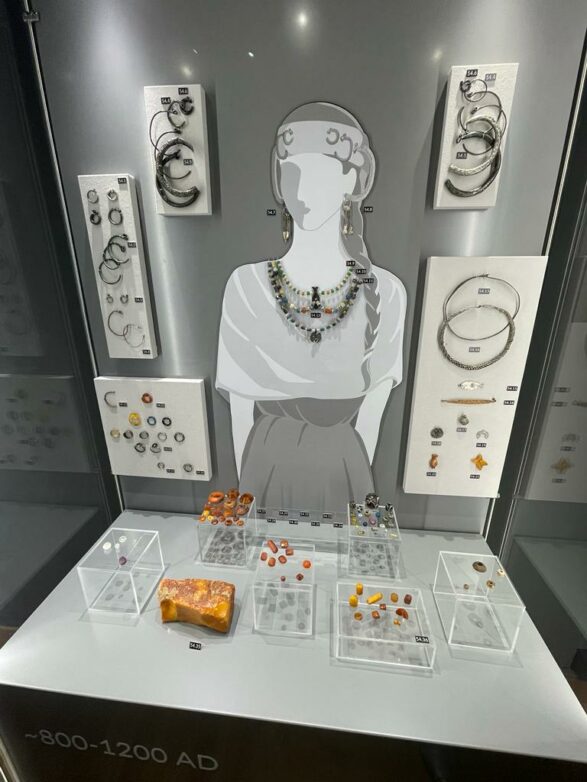 Und in vielen Fällen gibt es visuelle Abbildungen von Figuren, die zeigen, wie und wo der Schmuck oder die Kriegs- und Handwerksutensilien am Körper/Kleidung getragen wurden. Dazu kann man sich Informationen im Multimedia-System abrufen. Jedes Ausstellungsstück ist mit einer Nummer versehen, die sich dort leicht abrufen lässt.