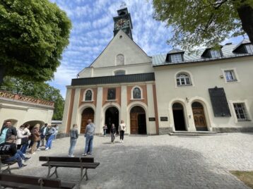 Zum Innenhof der Basilika, dem sogenannten Paradieshof, führen steinerne Stufen, die wir gemeinsam mit dem Schriftsteller Horst Bienek emporsteigen: … ich stehe … vor der Treppe zur Wallfahrtskirche, jener berühmten Treppe, blankgescheuert von Zehntausenden von Füßen, die hier alljährlich hinaufsteigen. Und die Frauen sind diese Stufen meist kniend hinaufgerutscht, laut betend und die Faust auf die Brust schlagend. Dreiunddreißig Stufen sollen es seine, jede Stufe für ein Lebensjahr Christi. … Oben angelangt, kommt man zuerst in einen weiten Vorhof, von dem aus es rechts zum Kloster geht und links zur Wallfahrtskirche mit dem Herzen der heiligen Mutter Anna. (Bienek