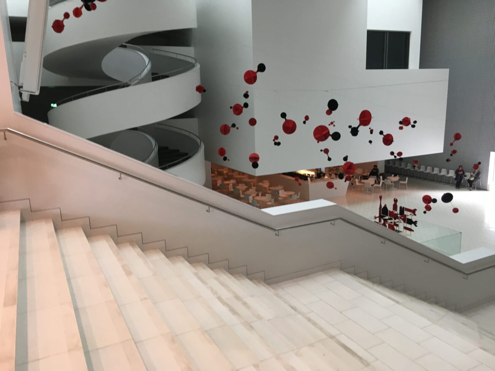 Tritt man durch den unprätentiösen Haupteingang in das Foyer, herrscht auch hier weiße lichte Großmaßstäblichkeit. Die räumliche Struktur ist klar und schnell erfasst: Rundum bilden die vielen kleinen Räume mit ihren dienenden Funktionen einen viergeschossigen Ring, der die großen Programmpunkte – den Konzertsaal für 1.000 und den Kammermusiksaal für 200 Zuhörer sowie einen multifunktionalen Bereich und das Foyer – umschließt und zum Funktionieren bringt. Ganz oben gibt es eine Ausstellungsebene und in zwei Untergeschossen eine Tiefgarage.“ Hier die Quelle dazu auf Baunetz.
