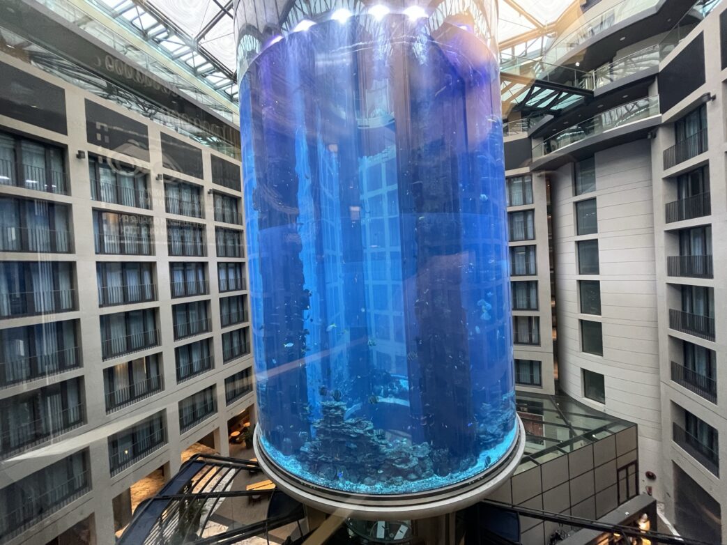 Im größten freistehenden Aquarium der Welt tummeln sich mehr als 1.500 tropische Fische aus über 60 Arten. Vom Cafe, der Hotelbar oder aus den gläsernen Liften aus kann man das quirlige Leben in dem riesigen Glaszylinder beobachten. Ich wurde bereits nach dem Einchecken auf das zum benachbarte Sealife gehörende Riesenaquarium aufmerksam. Eine Million Liter Wasser beinhaltet das gläserne Schauaquarium mit einem Durchmesser von elf Metern.