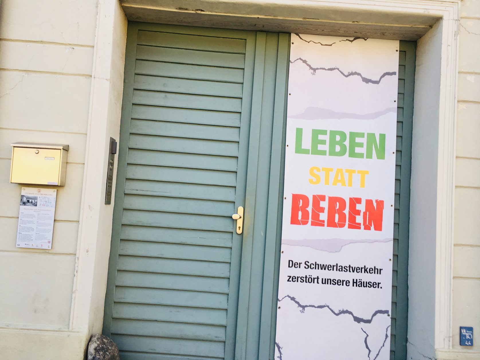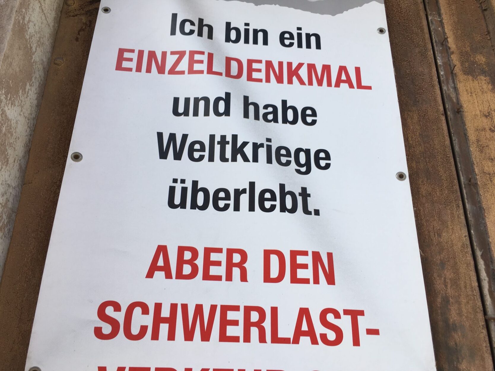 Kurz vor 9 Uhr erreichen wir das kleine Städtchen Rheinsberg, suchen nach einem Parkplatz, den wir gut ausgeschildert nahe der Mühlenstraße finden. Es kann losgehen mit unserer Stippvisite. Über die Mühlengasse wollen wir in die Stadt gelangen. Dabei werden unsere Blicke auf Schilder und Transparente an den Häusern gelenkt, die auf ein Verkehrsproblem in Rheinsberg aufmerksam machen. Schwerlastverkehr durch die enge Mühlenstraße macht nicht nur die Häuser kaputt, die Risse sind deutlich zu sehen, vor allem auch die Einwohner leiden täglich. Am Wochenende sind zwar die LKW aus dem Straßenverkehr verschwunden, dafür kommen Touristen meist mit dem Auto.