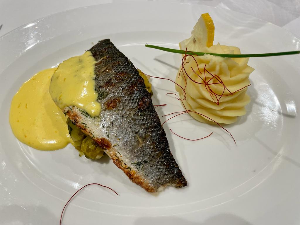 (Barschfilet, Blutorangen-Hollandaise, Kohlröschen, Pastinakenpüree)