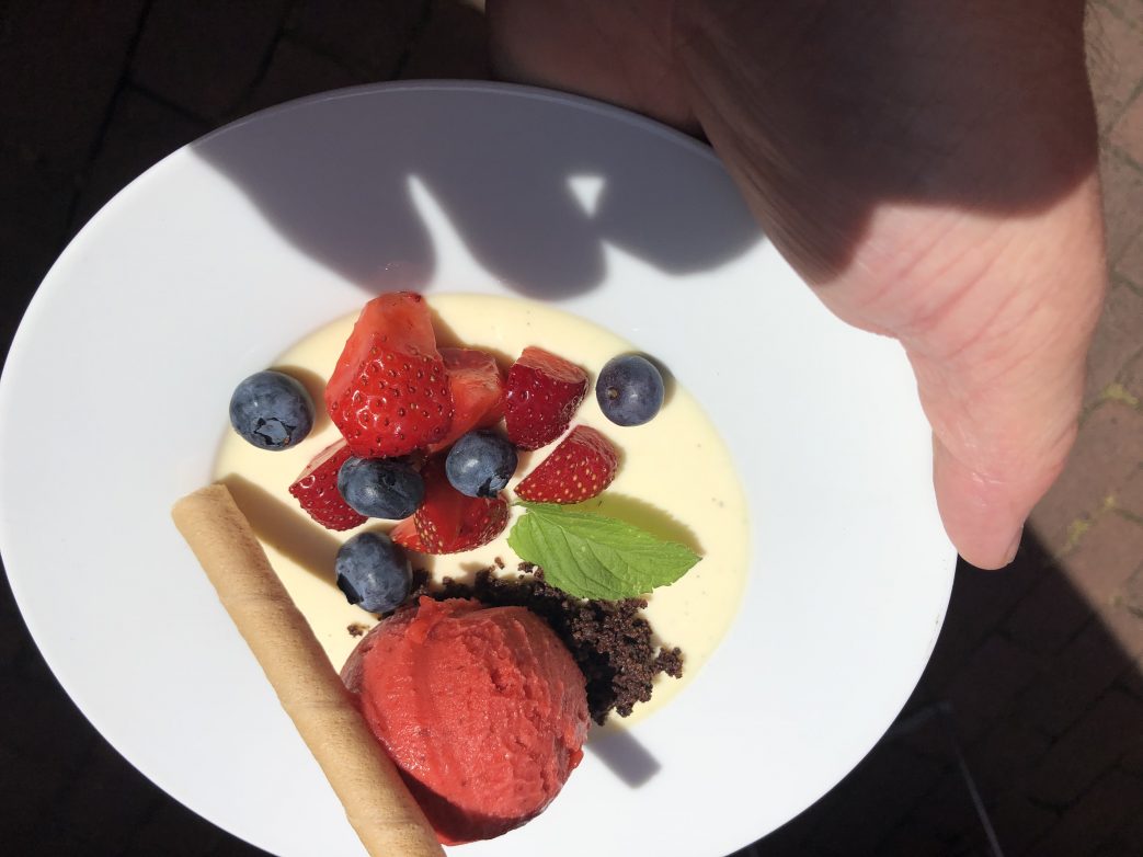 Zum Bürgstadter Roastbeef, Salsa, auf würzigem asiatischen Kopfsalat gibt es einen mit Gold ausgezeichneten Rosé (Domina Regent), der die scharfen Gewürze des Essens sehr gut zurücknimmt. Zum Schnittlauch-Ravioli mit Pfifferlingen auf einer Parmesanmolke gab es einen eleganten Rotwein (2016er Spätburgunder). Und zum leichten Milchreis-Panna-Cotta, Beeren und Erdbeersorbet empfiehlt der erfahrene Winzer Burkhard Hech eine Beerenauslese vom Pinot Noir. Diesen schmackhaften Gaumen-„Kur“-Teil werden wir so schnell nicht vergessen. Auch nicht die Sprüche des Winzers: „Ein guter Wein muss mindestens so viel kosten wie das Hauptgericht, 10 bis 15 Euro“. Oder angesprochen auf die Süße eines Weines: „Ein Wein wird aus Trauben hergestellt und nicht aus Bananen.“