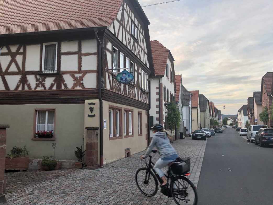 Als wir in Bürgstadt ankommen, ist es schon später Nachmittag. Unkompliziert können wir im Hotel Adler einchecken. Freundlich empfiehlt man uns, doch erstmal eine Pause mit einer kleinen Erfrischung einzulegen. Unsere Bleibe für vier Nächte mit Balkon und Blick in den grünen Garten lässt uns in eine andere Welt eintauchen. Die Stille, das satte Grün – nichts ist davon zu spüren, dass Bürgstadt sich gerade auf ein Wochenend-Hoffest aller Vereine vorbereitet.