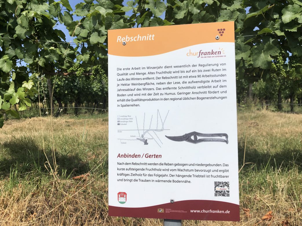 Wir wandern aus Zeitgründen nur ein Stück auf dem Fränkischen Rotwein Wanderweg. Er ist etwa 70 Kilometer lang und leicht in Etappen durch Churfranken, die Genießerregion am Main, zwischen Odenwald und Spessart, zu erwandern. Die Wanderung auf dem Fränkischen Rotwein Wanderweg ist einfach zu planen und zu jeder Jahreszeit durchzuführen. Auf der Churfranken-Homepage ist eine digitale interaktive Karte verfügbar, die jede einzelne Etappe und ihre Sehenswürdigkeiten in Wort und Bild umfassend beschreibt.
