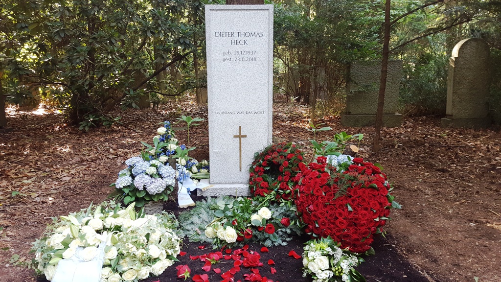 Ganz Deutschland ist berührt und betroffen vom Tod des beliebten Schowmasters Dieter Thomas Heckscher. Mehreren Generationen wird er als Sänger, Moderator und vor Allem als „Mister Hitparade“ in Erinnerung bleiben. Seine Grabstätte wurde nun auf dem größten evangelischen Friedhof Deutschlands am Rande Berlins eingerichtet, dem Südwestkirchhof Stahnsdorf. In sehr intimem und würdigem Rahmen nahm der engste Kreis der Familie und Vertrauter am 31. August Abschied. Die Urne wurde in einem der wildromatisch und kunsthistorisch bedeutenden Urnenhaine beigesetzt, den Grabplatz wählte die Familie. Ein schöner und schlichter Grabstein schmückt seine Ruhestätte und bietet Freunden, Wegbegleitern und Fans die Möglichkeit an seinem Grab zu trauern, zu verweilen und besonders intensiv zu erinnern.