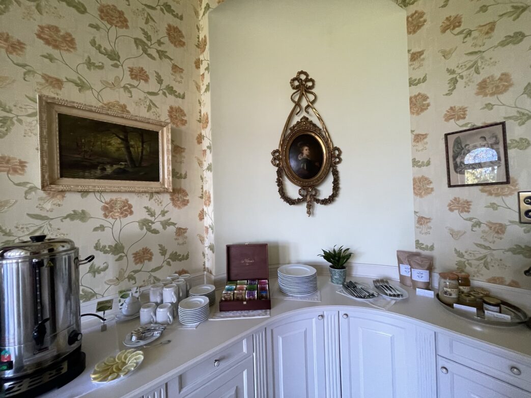 12 Zimmer hat das kleine Schlosshotel im beschaulichen Dorf, jedes ist individuell ausgestattet: mit Möbeln, die auf Auktionen und in Antikläden erworben worden. Immer wieder stechen die Details hervor: ob Blumentapete, Platzdeckchen, exklusive historisierende Badarmatur, selbst mit Spitzen verzierte Schrankborden. Erinnerungen an Omas gute Stube wurden da wach.