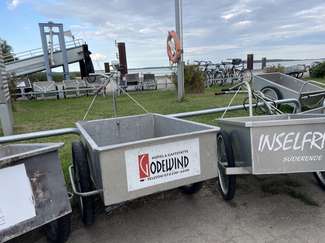 Ankommen im Hafen von Vitte auf HiddenseeIm Hafen in Vitte legt „Katharina von Bora“ an. Auffällig, keine Taxen und Autos, die die Gäste abholen wollen. Dafür viele Fahrräder und ein paar Fahrradanhänger mit Adresse der Vermieter für das Gepäck. Weder Gestank noch Lärm von Autos empfängt uns. Der Geruch von Pferden liegt in der Luft. Vor dem Schiff warten zwei Planwagen, gezogen von Pferden. Davor zwei Kutscher-Guides, die schon auf uns warten. In einer zweistündigen Fahrt wollen wir stippvisitenartig ein bisschen Inselflair genießen.
